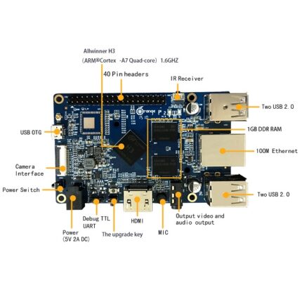 | GPIO connectors | RPi compatible 13×2-pin header on the top side as well as bottom side for 2-way stacking 20+6 pin header for additional GPIO/ADC/Power/USB connection Total 32 GPIOs and 2 ADCs are available. |
